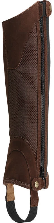 Ready to meet any challenge.These unisex chaps are made with beautiful suede and mesh with elastic back and side panels and a suede inner panel.They have a full-length side zip system and a moderate Spanish-cut top line.They are then finished with a contoured suede skirt over the instep.