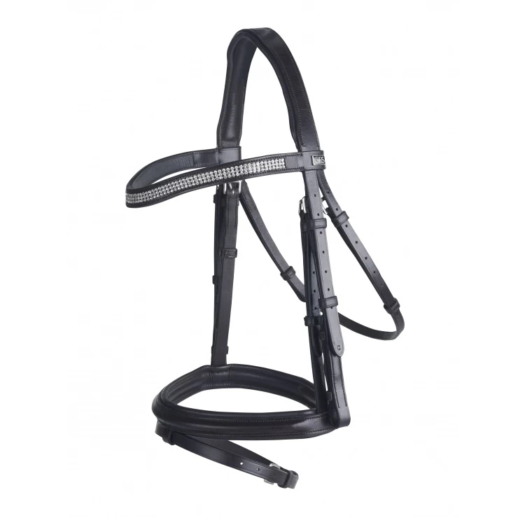 A beautifully crafted leather bridle, with an anatomically shaped padded headpiece to relieve poll pressure and contour around the ears, also with a padded cavesson noseband to provide extra comfort for your horse. Comes as standard with a diamante browband. The bridle comes with rubber grip reins.