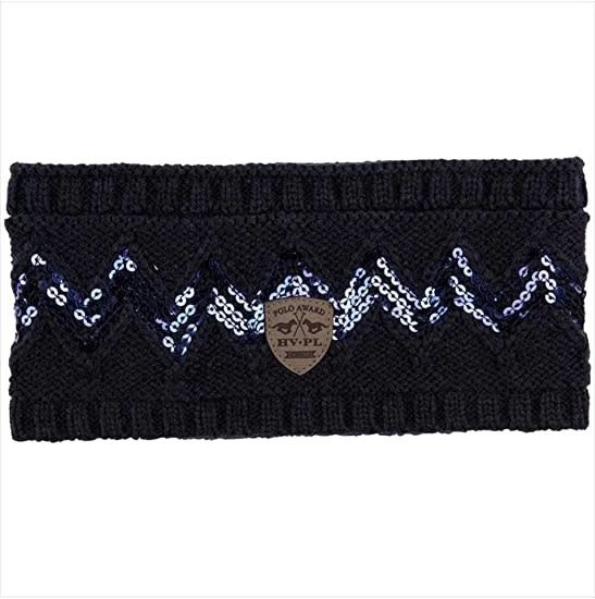 Knitted headband with sequin design. Fleece lined for comfort. Outer 100% Modacrylic