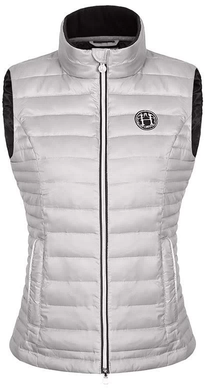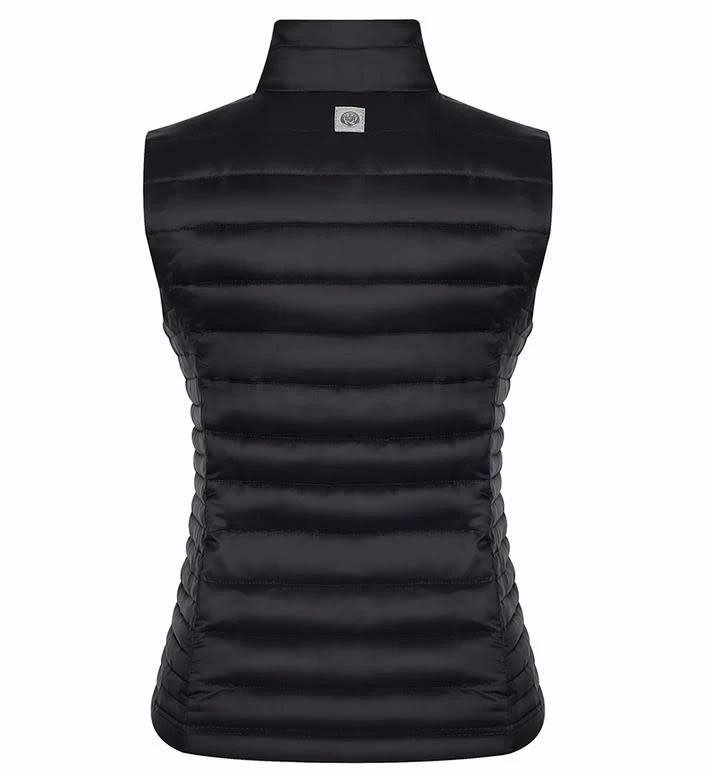 Slim fitting feminine polyfill body warmer with 2 way front zip & logo on chest.