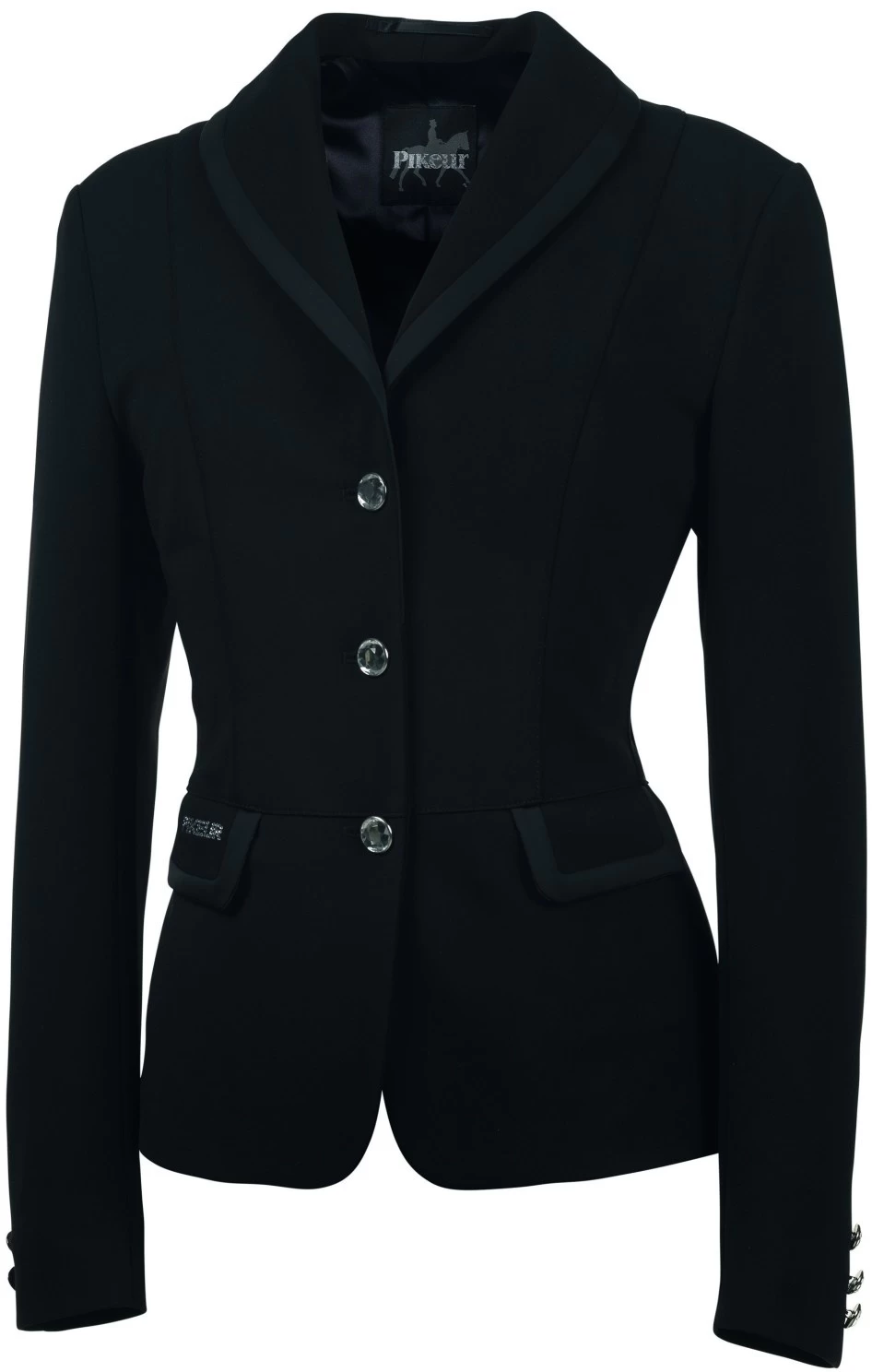 Close-cut short fitting jacket in a super stretchy jersey fabric with a satin bound Shawl Collar.
